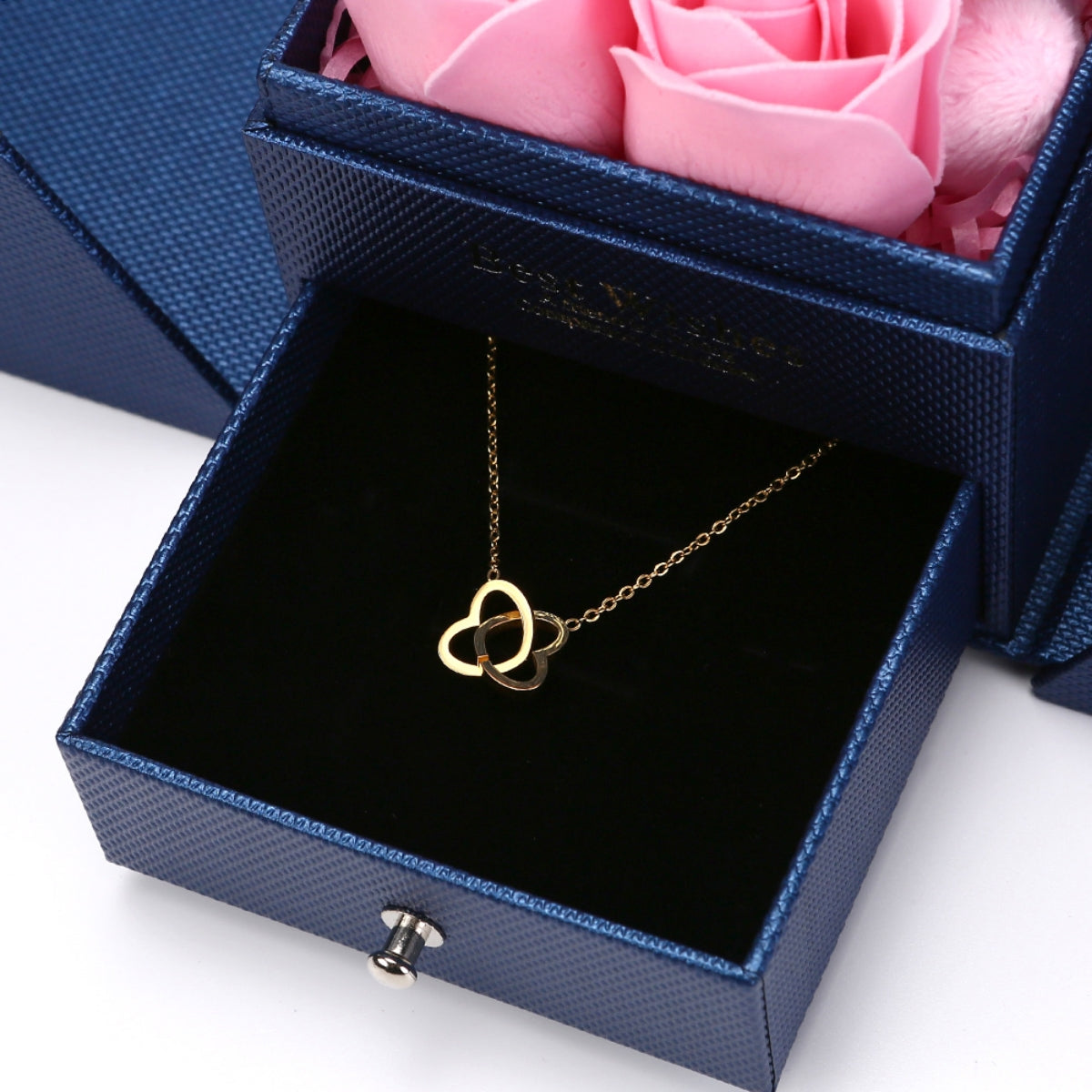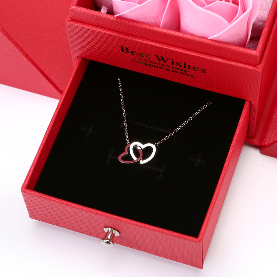 Öffnen Sie die Geschenkbox und enthüllen Sie wunderschöne ewige Rosen mit einem süßen Bär. Die Luxus-Halskette befindet sich in der Schublade darunter.