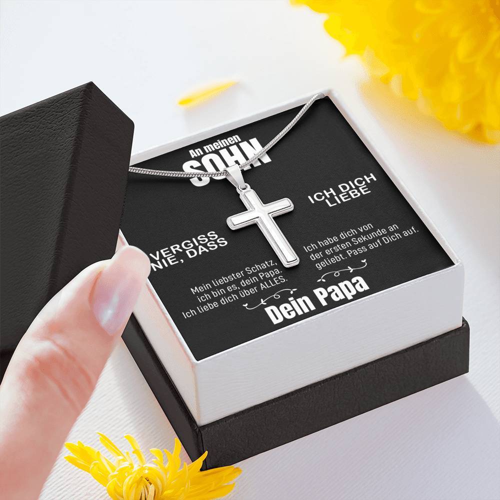 Ein Anhänger in Kreuzform aus polierten Edelstahl. Der richtige Schmuck für den geliebten Sohn. Das handwerklich gefertigte Detail hebt diesen Anhänger von anderen Halsketten ab. Inklusive einer verstellbaren Schlangenkette, die mit einem sehr einfach zu bedienenden Karabinerverschluss befestigt wird.