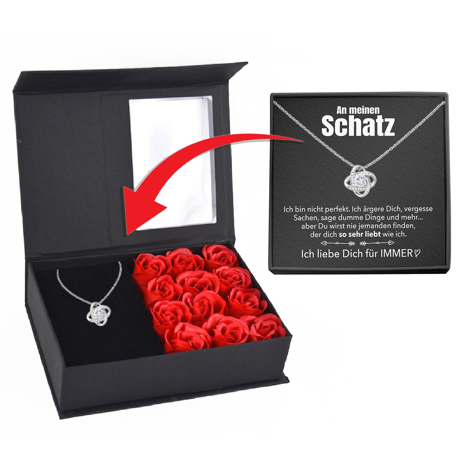 Rosenbox mit Notiz - Weißgold Ausführung Liebesknoten Halskette - An meinen Schatz